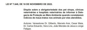 A prefeitura do Rio de Janeiro sancionou uma lei que obriga veterinários e atendentes de pet shops a informarem o estado de saúde dos animais caso estejam com sinais de agressões e falta de cuidado adequado. As denúncias deverão ser feitas à Delegacia de Proteção ao Meio Ambiente informando o nome, o endereço e o contato do acompanhante do animal, relatório do atendimento prestado com espécie, a raça e características do animal é o estado em que ele se encontra.