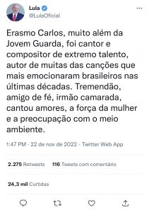 O futuro presidente da nação, Luiz Inácio Lula da Silva usou suas redes sociais para lamentar a perda do ícone da Jovem Guarda.