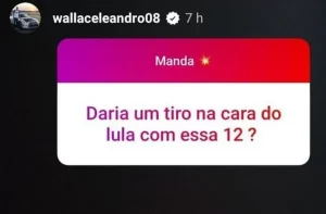 O ex-jogador da seleção brasileira de vôlei, Wallace de Souza divulgou em seu Instagram nesta terça-feira (31) uma enquete feita por um seguidor perguntando quem teria coragem de disparar contra o presidente Lula com uma arma de fogo. Em seus stories o mesmo postou uma foto com uma pistola respondendo um seguidor que perguntou qual era a arma que Wallace mais gostava de usar para atirar.