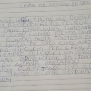 O menor infrator de 13 anos de idade que realizou um ataque hoje pela manhã na Escola Estadual Thomázia Montoro Zona Oeste de São Paulo, havia deixado em seu caderno uma carta pedindo desculpas a sua família pelo ataque viria a fazer na escola, indicando que o menino já estava planejando-o há tempos. Na carta, ele pede perdão à mãe, a avó, a tia e ao irmão pelo que estava por vir e que arquitetava um plano de vingança contra os colegas que praticavam bullying contra ele na escola.