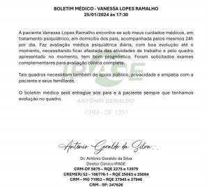 “A paciente Vanessa Lopes Ramalho encontra-se sob meus cuidados médicos, em tratamento psiquiátrico, em domicílio dos pais, acompanhada pelos mesmos 24h por dia. Faz avaliação médica psiquiátrica diária, com boa evolução até o momento, necessitando ficar afastada das atividades de trabalho e pelo quadro apresentado no momento, tem bom prognóstico. Foram solicitados exames complementares para avaliação clínica completa”, diz o laudo.